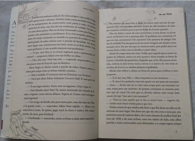 O livro em si é MUITO bom e eu recomendo, mas preciso dizer que o que eu mais gostei foi a parte musical. Mia é violoncelista, o que traz algumas referências da música clássica, mas seu pai foi baterista de uma banda de rock e toda a família adora o estilo, o que traz mais milhões de referências do rock. Eu adoro conhecer bandas novas e tem um tempinho que comecei a ouvir alguma coisa de rock e incorporar o gênero à minha playlist, então eu fiquei super feliz quando o livro facilitou meu trabalho e me deu um monte de bandas e nomes para futucar na internet. Apesar de não ter gostado de todas, me apaixonei por boa parte das referências musicais. Ainda sobre o tema, eu gostaria de dizer que achei as páginas do livro LINDAS! *-*
